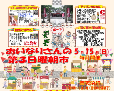 2022年5月22日(日)庄内神社・日曜朝市を開催いたします 素晴らしく晴天に未恵まれて五月晴れを感じる日が有るかと思えば! どんよりとして、少し肌寒い日が有る今年の5月! でも、「庄内神社日曜朝市」は恒例通り22日(日)に開催いたします。 どうぞお気軽にお立ち寄りください。 お待ちしておりますm(__)m