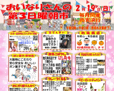 2023年2月26日(日)庄内神社・日曜朝市を開催いたします 2月の「庄内神社・日曜朝市」は26日に開催いたします。 13時頃までの開催予定ですが、状況により前後することがございますのでご了承ください。 また、雨天決行ですが、お店さんによってはお休みされることもございます。 まだまだ寒い日が続きますが、どうぞお気軽にお立ち寄りくださいね! 皆様のお越しをお待ちしておりますm(__)m