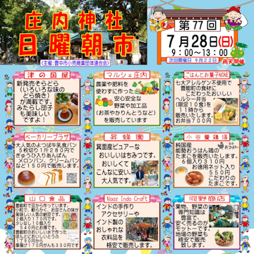 2024年7月21日(日)おいなりさんの第3日曜朝市を開催いたします 7月の「おいなりさんの第3日曜朝市」は21日に開催いたします。 9時から14時ごろまでの開催予定ですが、状況により前後することがございます。 また、朝市自体は雨天決行ですが、お店さんによってはお休みされる場合もございます。なにとぞご了承ください。 そろそろ梅雨も明けて本格的に暑くなりそうです。 どうか熱中症や紫外線に気を付けて、体調をを崩されないようにお体ご自愛下さい。 皆様のお越しをお待ちしておりますm(__)m