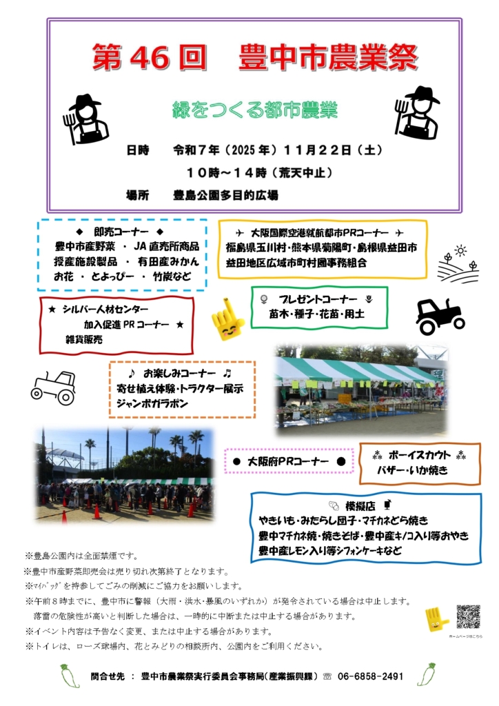 2025年11月22日(土)、豊島公園(阪急宝塚線曽根駅より南へ徒歩約5分)にて毎年恒例の「豊中市農業祭」が開催されます。