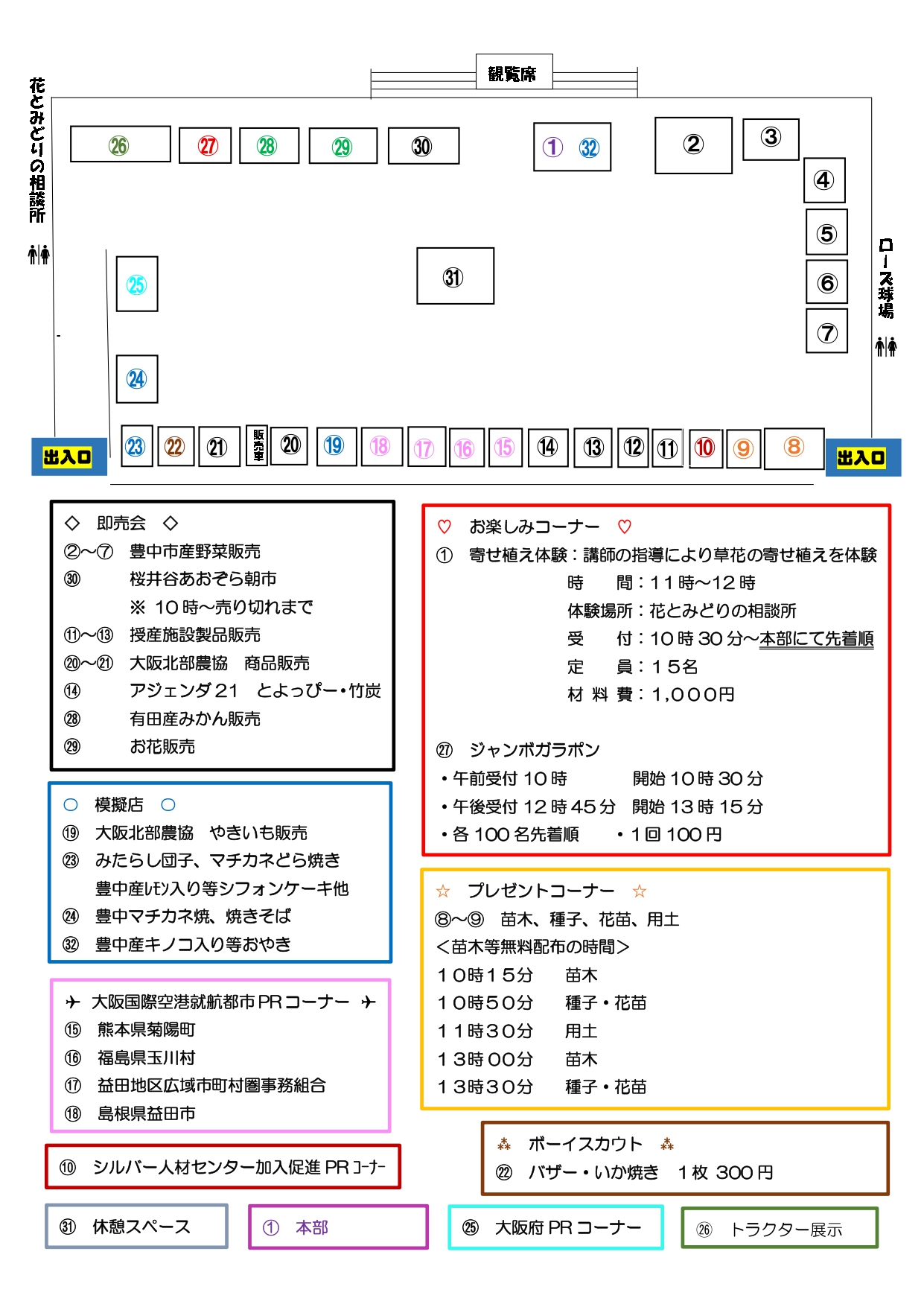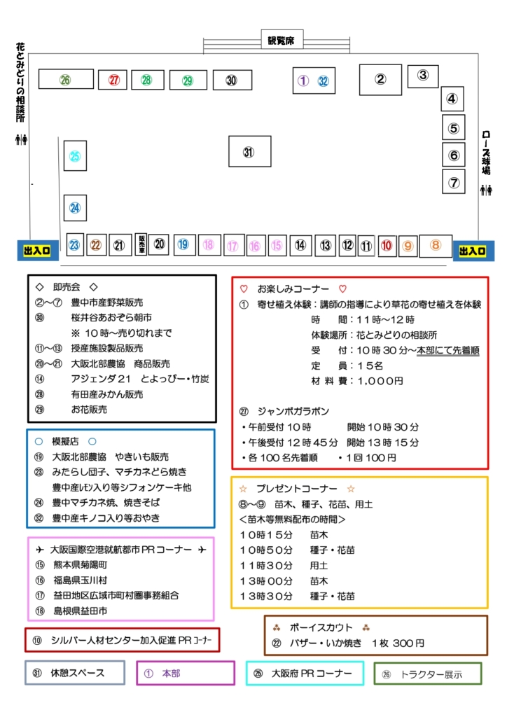 寄せ植え体験(材料費要 定員15名)、ジャンボガラポン抽選会(1回100円)、苗木や種苗のプレゼント、食べ物の模擬店など楽しい催しが盛りだくさんです。