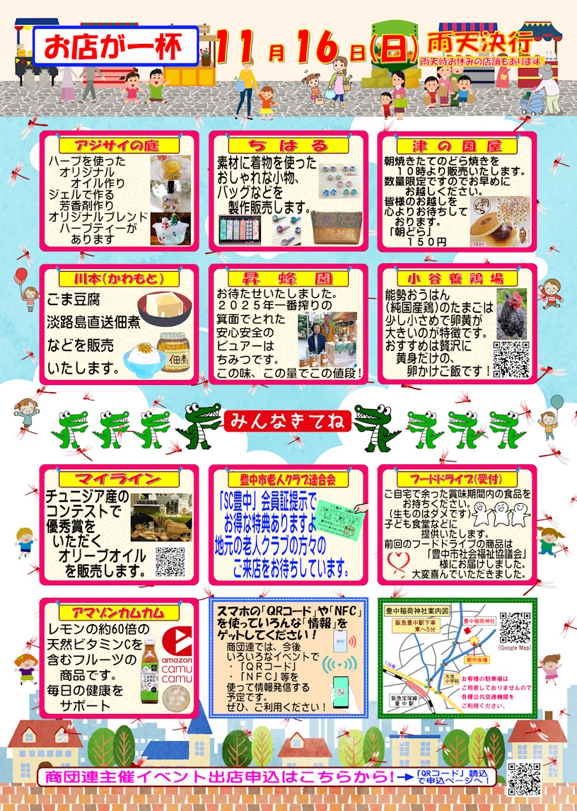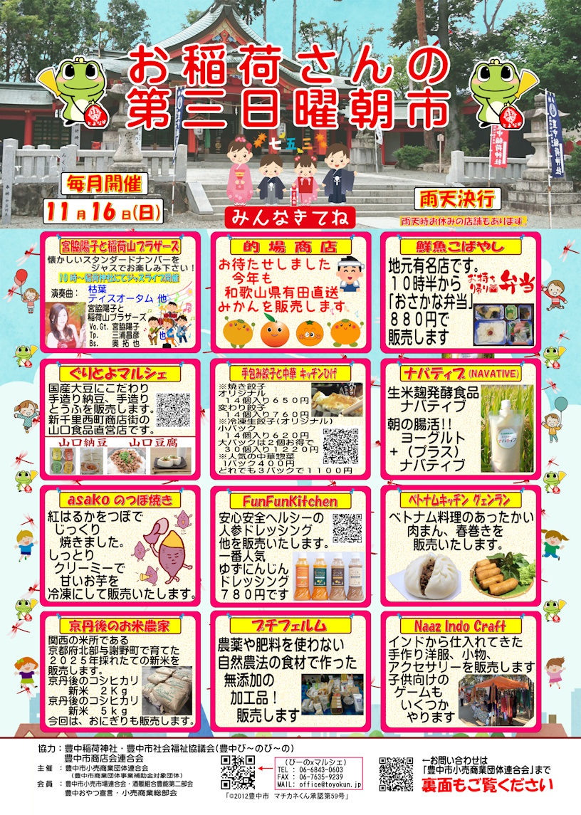2025年11月16日(日)おいなりさんの第3日曜朝市を開催いたします 11月の「おいなりさんの第3日曜朝市」は16日(日)に開催いたします。 9時から13時30分ごろまでの開催予定ですが、状況により前後することがございます。 また、朝市自体は雨天決行ですが、お店さんによってはお休みされる場合もございますのでご了承ください。 この頃、朝晩が冷え込む日が多くなりました。急な気温差で体調を崩されないよう、服装などで調整してお過ごしくださいね。 皆様のお越しをお待ちしておりますm(__)m